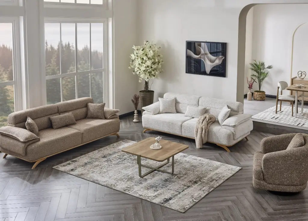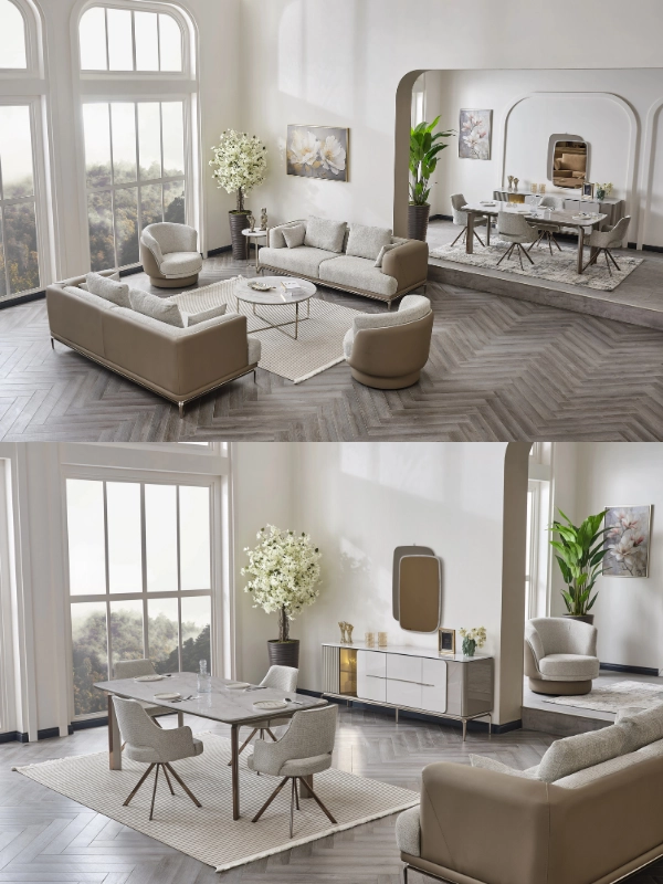 Combining elegant metal details, marble-textured surfaces, and sophisticated mink tones, the Likya Collection brings modern luxury and a distinguished atmosphere to your living space.