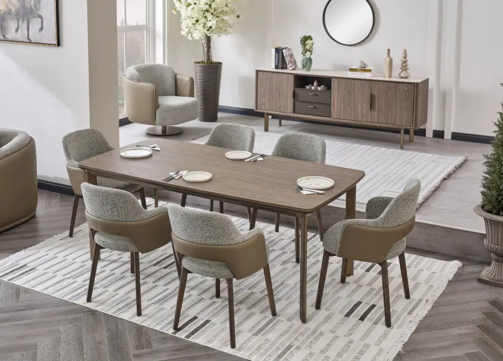 Fusing the harmony of contrasting colors with elegantly curved chair forms, it brings a modern yet natural aesthetic to your dining experience.