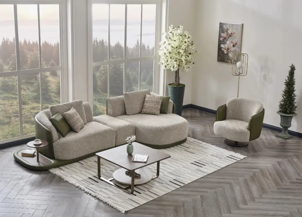 With its rounded modular structure and elegant design with leather details, it creates a unique comfort and a high-level visual richness in your living space.